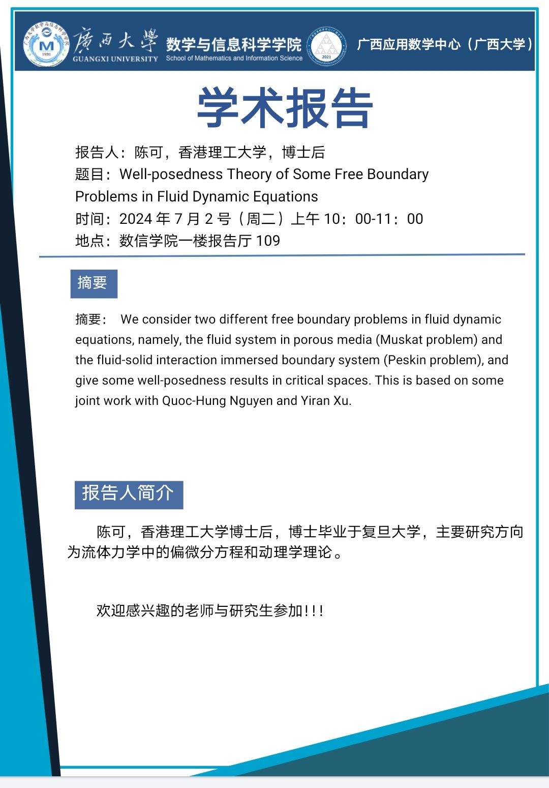 学术报告:Well-posedness Theory of Some Free Boundary Problems in Fluid Dynamic Equations