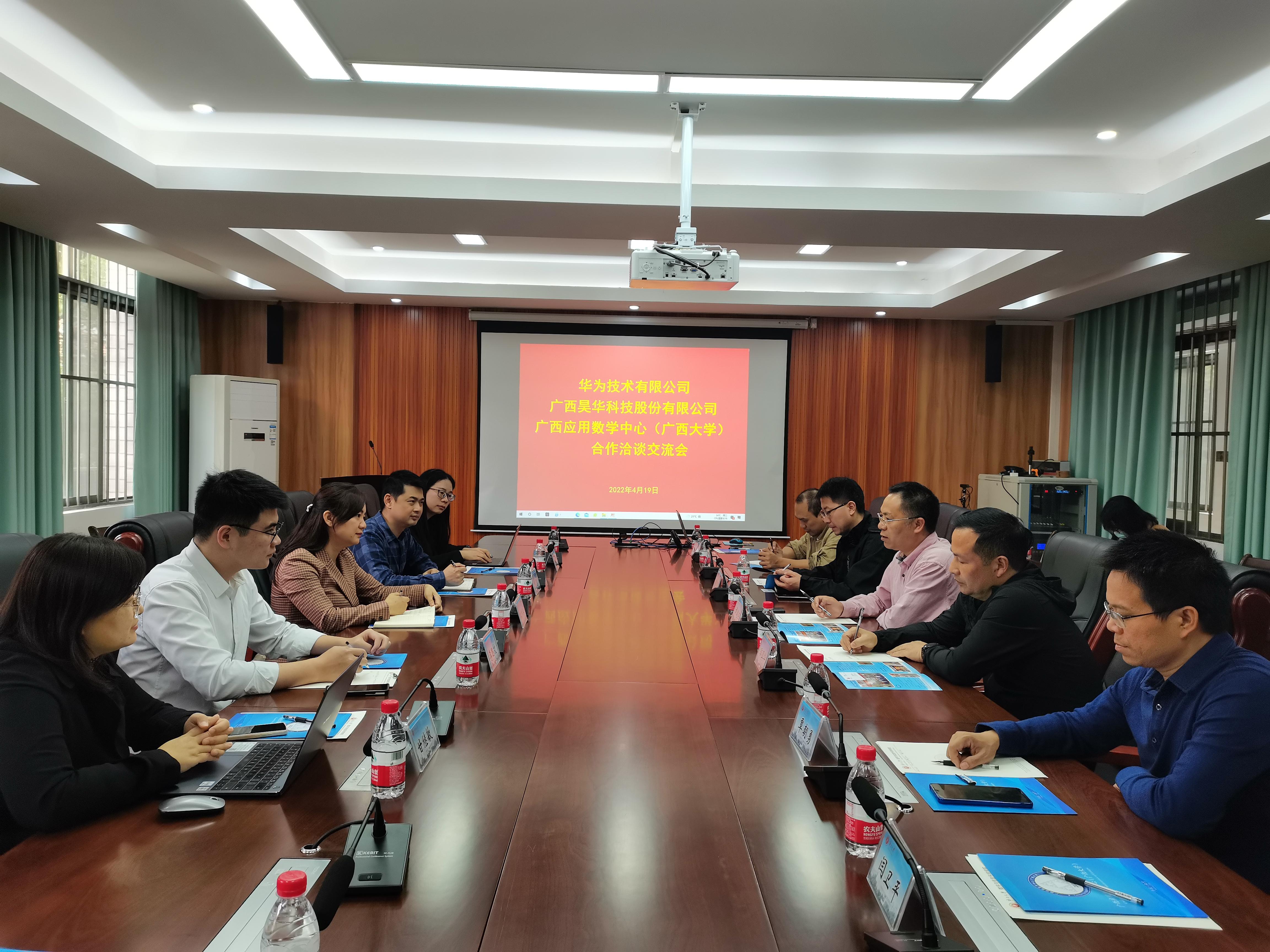 2022年4月19日,华为技术有限公司、广西昊华科技股份有限公司和广西应用数学中心(英国正版365首页官网)在英国正版365首页官网举行合作交流洽谈会。广西昊华科技股份有限公司副总裁滕杰英、大客户经理黄慧,华为广西院校人才发展业务经理甘继敏,华为广西政企教育行业代表李思文,华为-南宁数字经济产业创新中心高校顾问龙婷婷,英国正版365首页官网党委书记黄建荣、院长郭真华,广西应用数学中心(英国正版365首页官网)常务副主任、英国正版365首页官网英国正版365首页官网副院长常袁功林,广西应用数学中心(英国正版365首页官网)团队负责人等参加了此次交流。