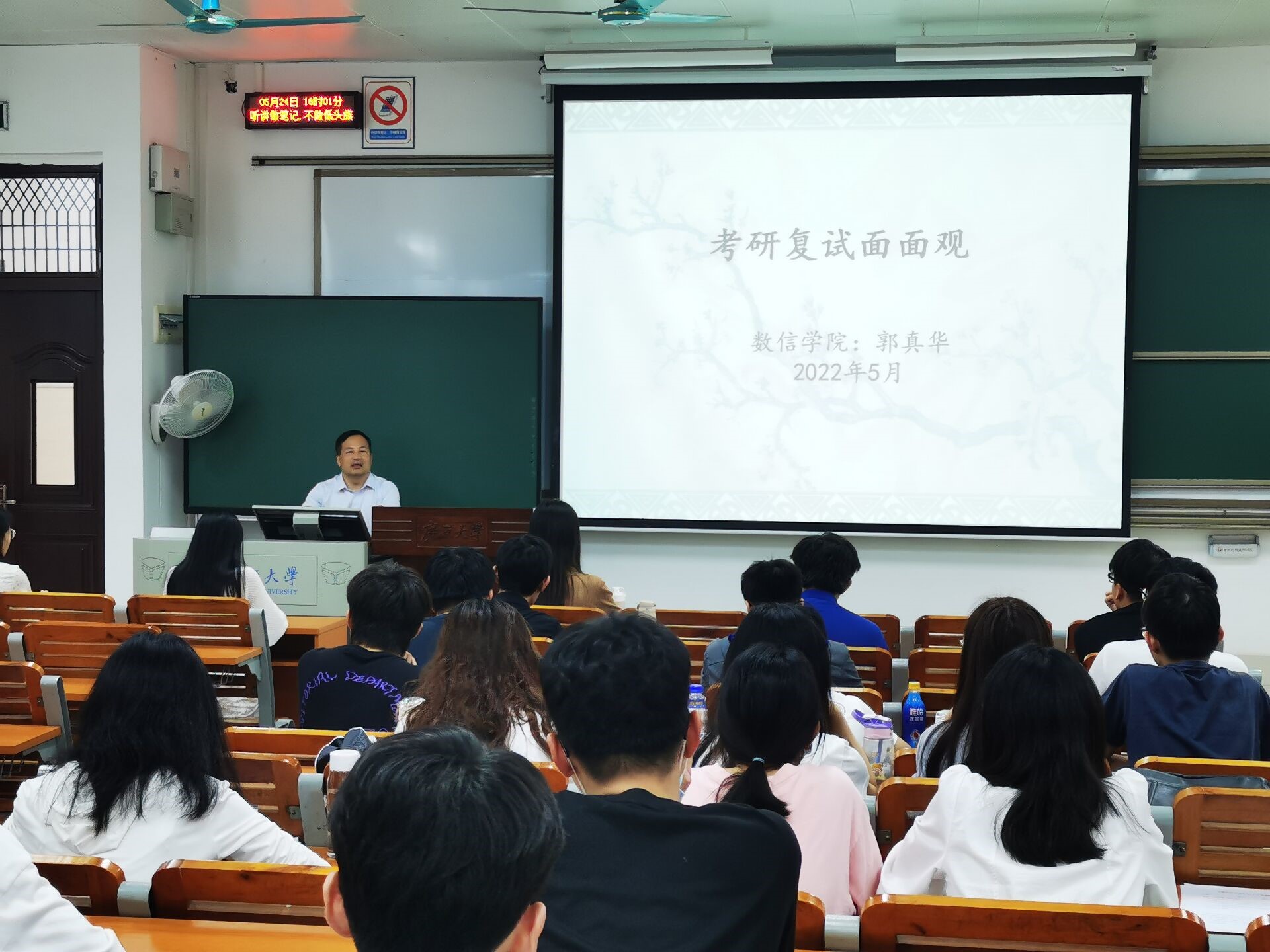 会上,郭真华院长从社会发展和人才需求的角度详细分析了全国近几年的考研形势和学科就业前景,并就考研面试的主要形式、面试礼仪、常见问题等内容进行了专题培训,对同学们在考研学校选择、考研复习知识等方面碰到的问题进行了对策指导。他表示,学院始终把学生考研工作作为提高人才培养质量的有效抓手。学院将进一步加强考研工作联动机制,推动学院考研工作再上新台阶。希望同学们在思想上高度重视,立足自己的兴趣、能力选择报考院校和专业,确定目标并持之以恒。