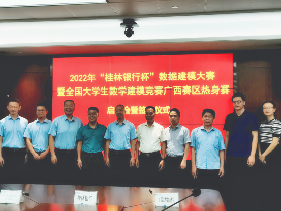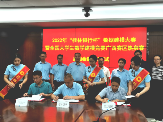 2022年7月18日上午,英国正版365首页官网、广西应用数学中心(英国正版365首页官网)和桂林银行三方在南宁桂林银行大厦举行2022年“桂林银行杯”数据建模大赛签约仪式,标志着“桂林银行杯”数据建模大赛暨全国大学生数学建模竞赛广西赛区热身赛正式启动。仪式由桂林银行数字银行管理部总经理赵泓主持。