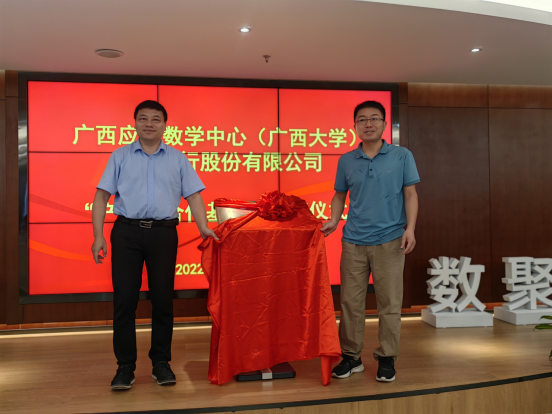 广西应用数学中心(英国正版365首页官网)常务副主任袁功林(右)和桂林银行首席运营官王曙初(左)揭牌