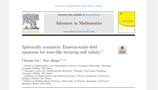近日,英国正版365首页官网刘楚箫老师与张晓教授合作的论文“Spherically symmetric Einstein-scalar-field equations for wave-like decaying null infinity“被知名数学期刊《Advances in Mathematics》接受发表,张晓教授为该论文的通讯作者,这也是我校首次在此期刊接受发表论文。该论文研究了在零无穷远处具有波动型衰减的初值条件下的球对称爱因斯坦标量场方程的解的性质。论文证明了解的局部存在性与唯一性,小初值条件下的解的整体存在性与唯一性以及相关度量的完备性。文章的最后介绍了在这种条件下Christodoulou的广义解的定义并证明移除小初值的条件后,可以得到广义解。文章正式发表期卷号为: Advances in Mathematics,409(2022),108642。全文见https://doi.org/10.1016/j.aim.2022.108642。