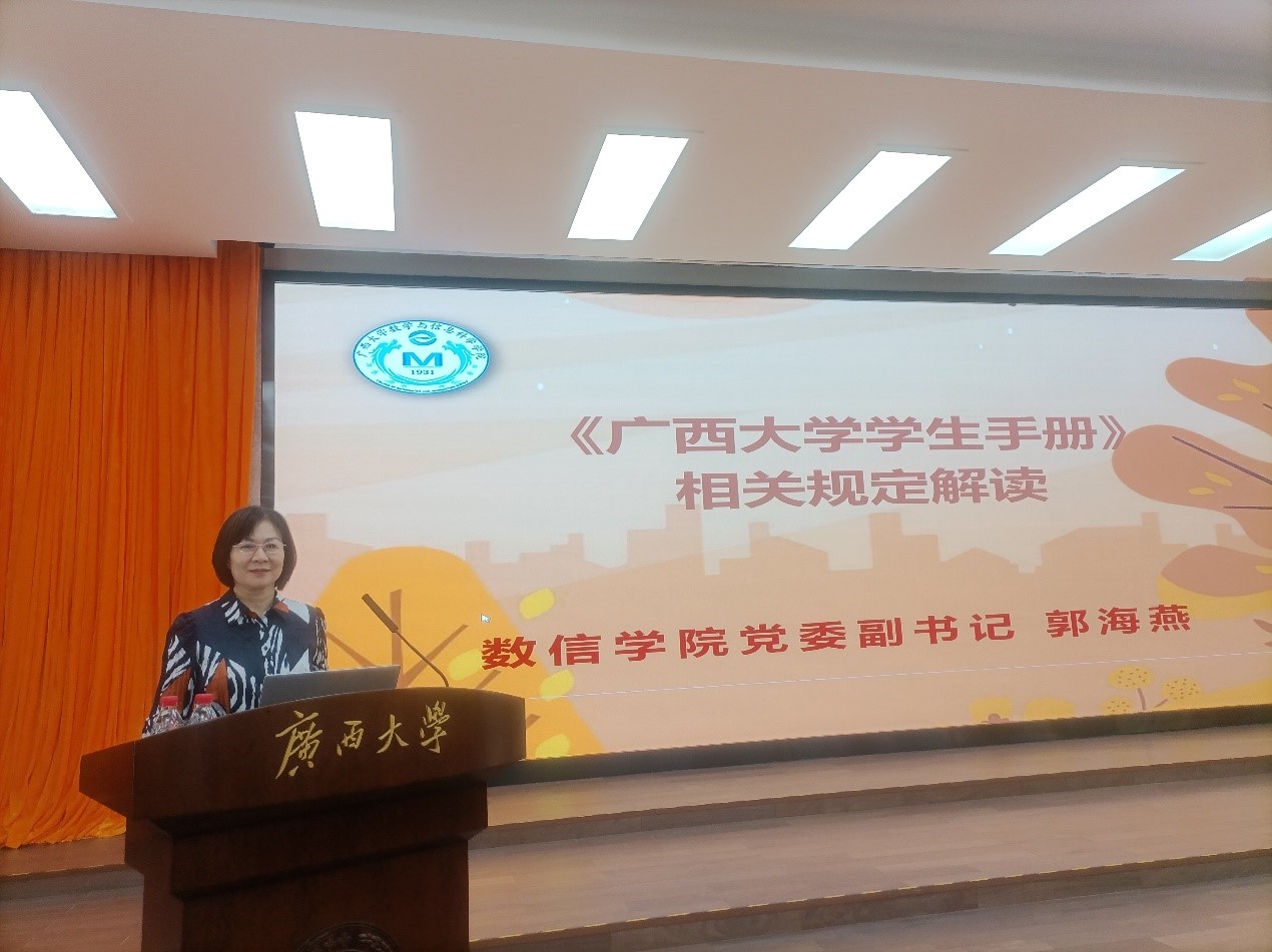 为了让2023级新生更快的适应大学校园生活,更好的了解学校的规章制度,守纪律、讲规矩,近日,英国365官网开展了一系列新生入学教育。学院党委副书记郭海燕做学生规章制度讲解专题讲座,专任教师于毅、辅导员刘春霞等老师分别做学生生涯规划教育。