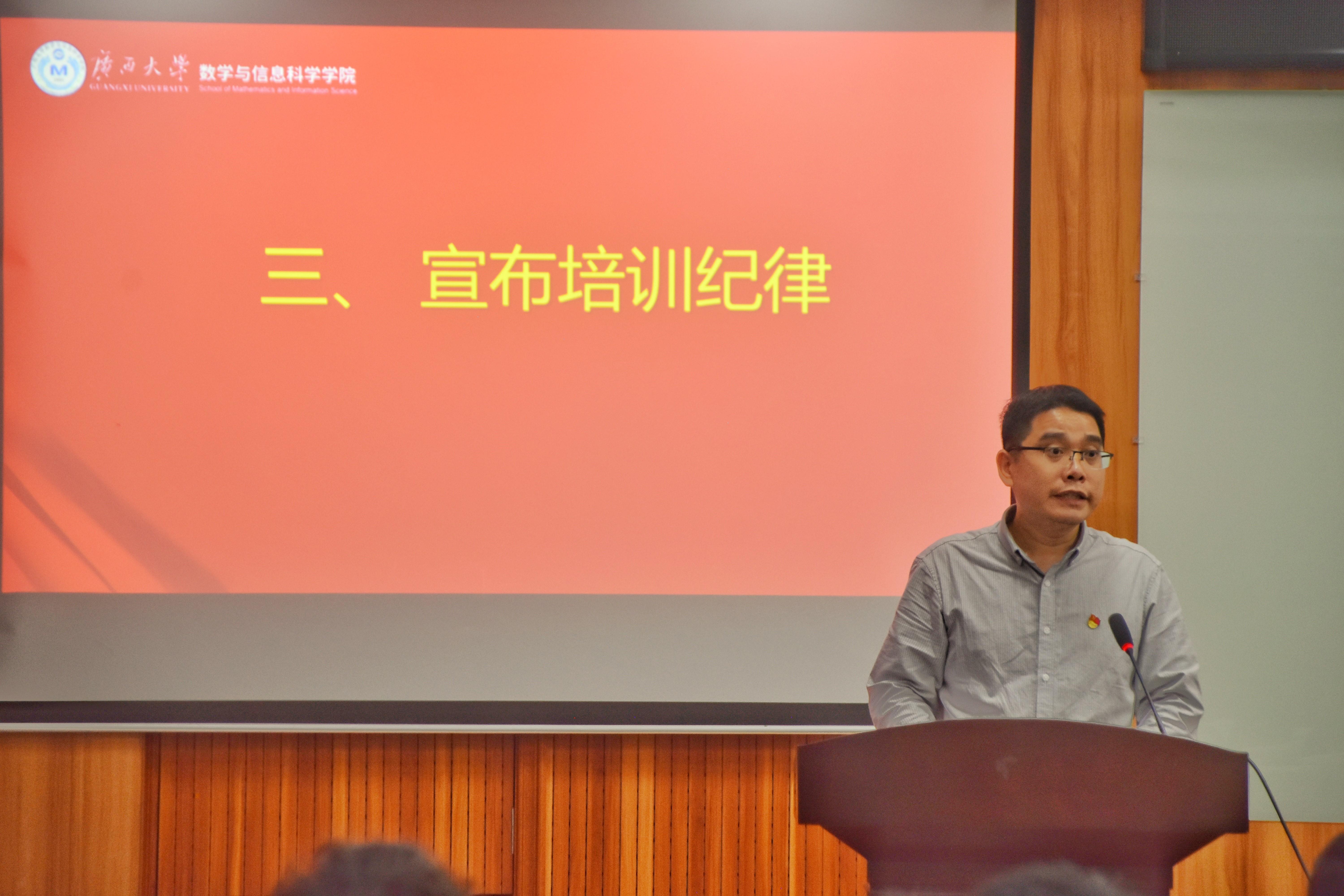 开班式在雄壮的国歌声中拉开帷幕。数学类222班韦梅馨、数理创培211班尹荟杰、2021级硕士研究生吴广德等三位同学分别作为积极分子代表、发展对象代表和预备党员代表发言并表态,表示全体学员要以此次培训为契机,用党的先进理论武装自己的头脑,坚定理想信念,提升政治站位,提高思想认识,高标准、严要求完成培训学习,早日成为一名真正的共产党员。随后,学院专职组织员王支柱老师宣读了培训纪律。