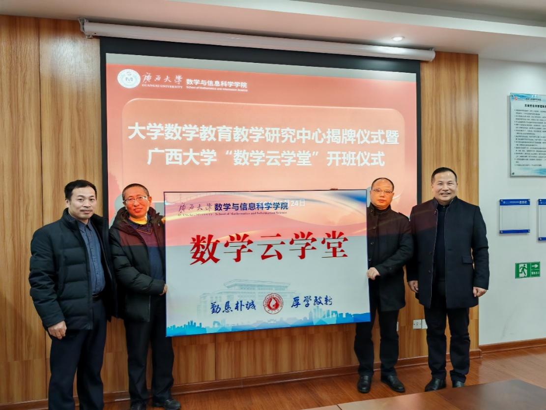2024年2月24日上午,英国正版365首页官网大学数学教育教学研究中心揭牌仪式暨英国正版365首页官网“数学云学堂”开班仪式在学院506会议室举行。学院党委书记覃宪儒、院长郭真华为大学数学教育教学研究中心揭牌,郭真华和特邀专家华中农业大学陈华锋老师为英国正版365首页官网“数学云学堂”开班授牌。