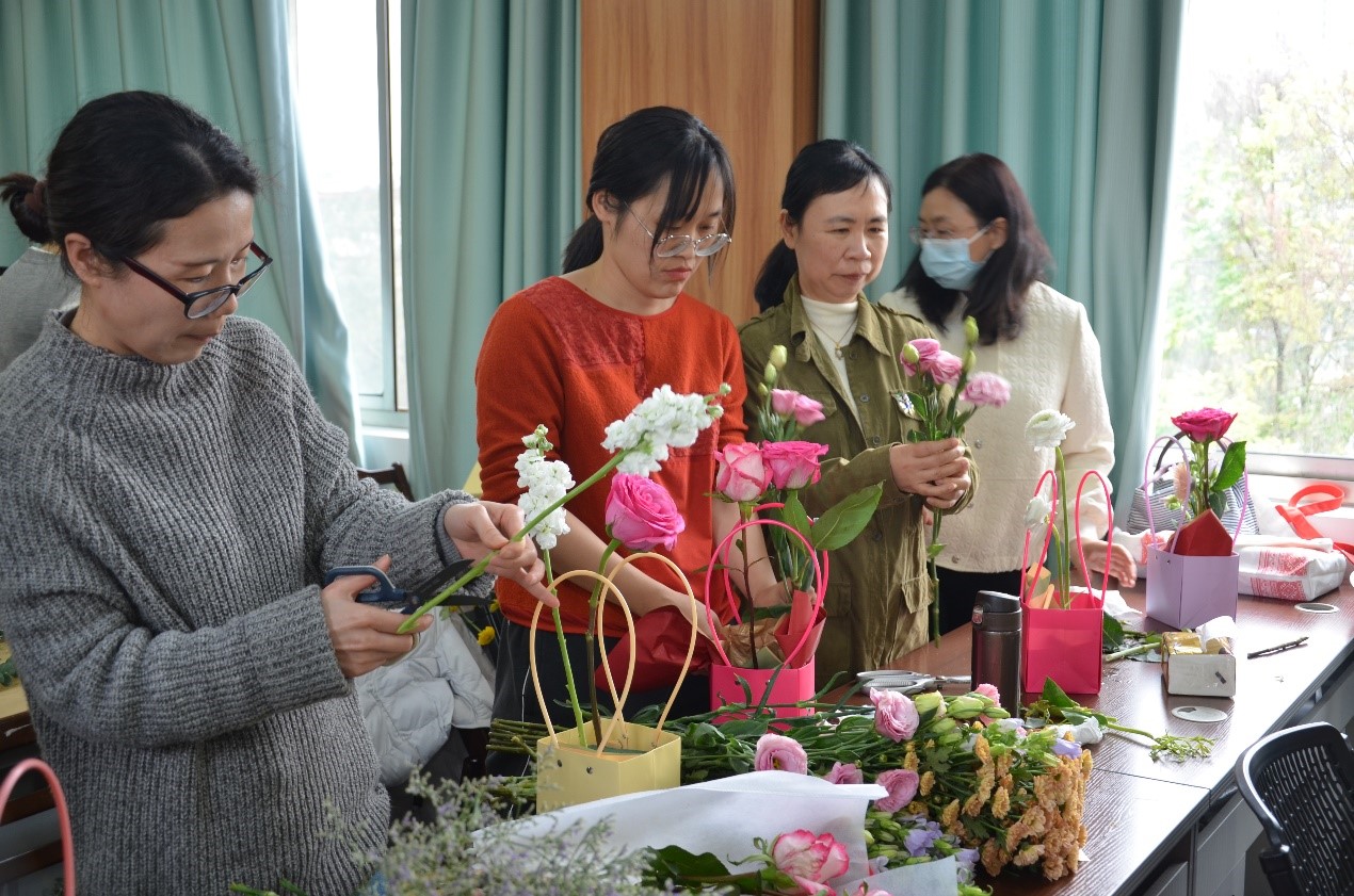 李林教授在花艺基础知识讲座中,从花材种类、颜色搭配、造型原理、作品鉴赏以及插花创作等方面为老师们科普鲜花花语和插花技巧,并现场展示经典插花造型。女教工们在老师的悉心指导下,大胆发挥自身想象力,根据手中的花材特点、颜色,创意修剪、搭配,每个人脸上都洋溢着幸福快乐的笑容,在轻松愉快的氛围中感受插花艺术的魅力,一束束错落有致、创意十足的“私人定制”花艺作品在老师们手中被赋予了新的芬芳。