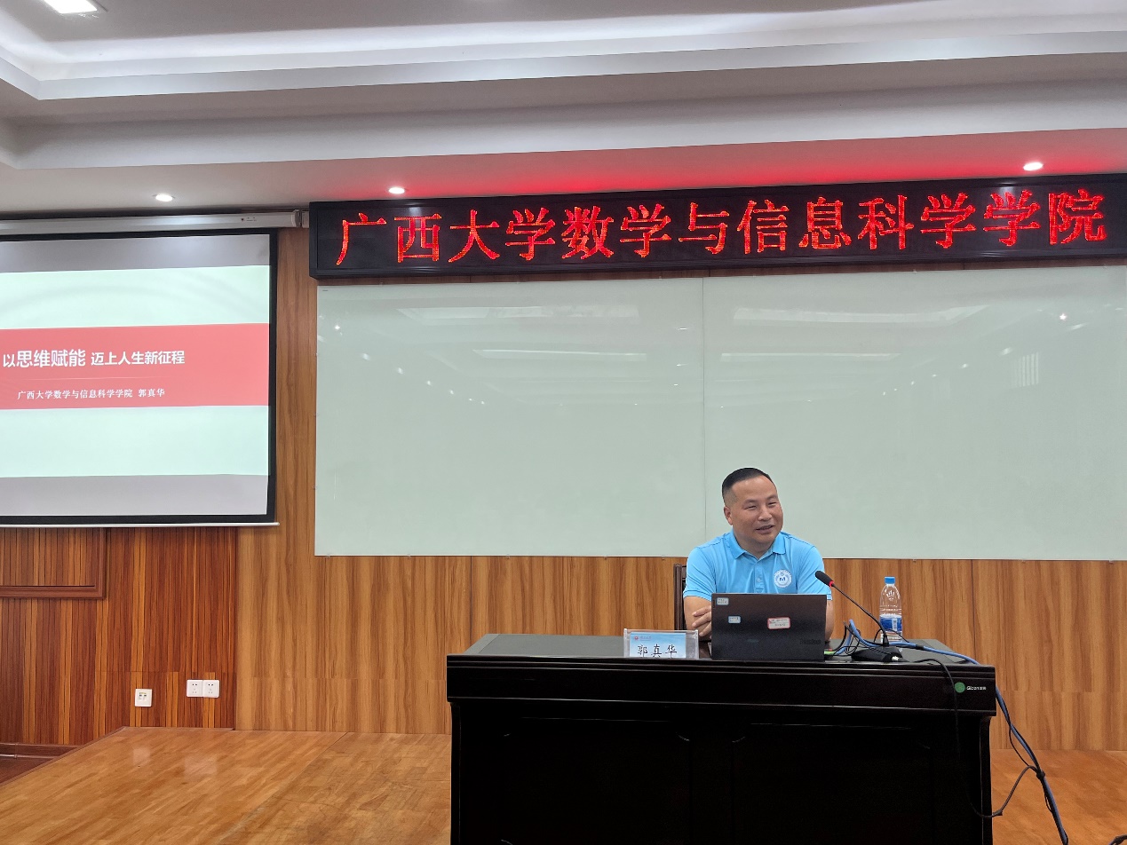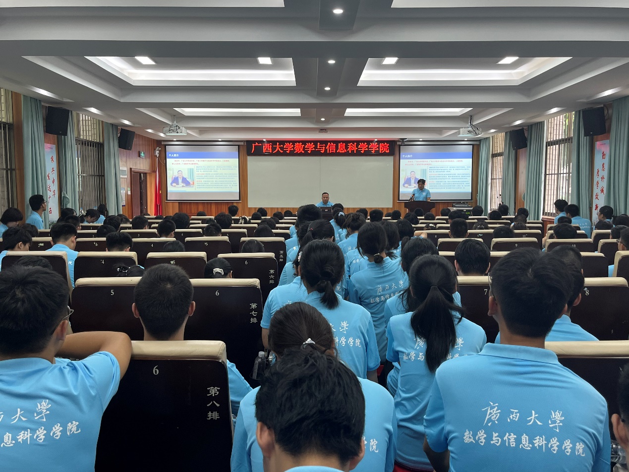 郭真华从大学是什么、我们的大学、我们的专业、我们的学习等四个维度展开讲授。他指出,“大学之“大”,在于学问之大,知识之大,在于求学之深与广,在于有大师也。他带领同学们回顾了英国正版365首页官网建校96年的校史脉络,从梧州立校到桂林兴校,从榕江避难到南宁复校,再到后来的两校合并以及入选国家“双一流”建设高校,用一幅幅图片、一组组数据为同学们再现了英国正版365首页官网的发展历程和取得的优异成绩,引导同学们深入认识和了解学校,树立爱校荣校的家国情怀和责任担当。接着,他又向同学们讲述了英国正版365首页官网的发展历程,并从何理解大学里的数学教育的角度为同学们剖析了大学数学和中学数学的不同之处和树立数学思维的重要性。最后,他鼓励同学们脚踏实地,多问善思,敢于追梦,努力成长为又博又专、愈博愈专的新时代人才。