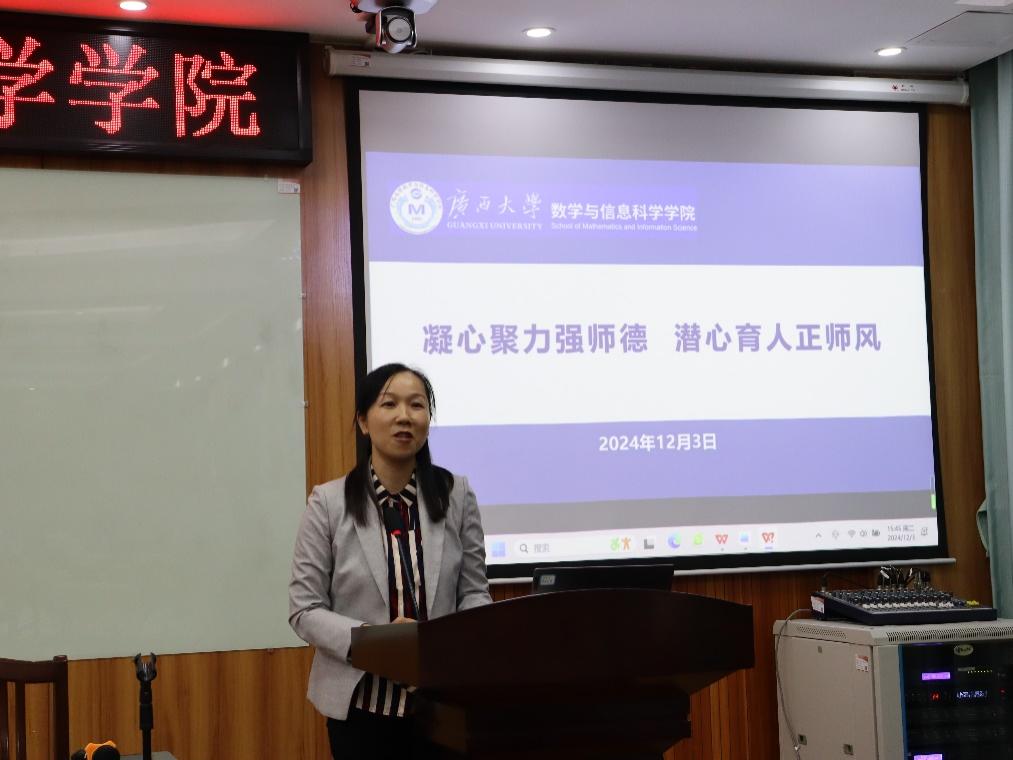 吴华丽在会上作了题为“凝心聚力强师德 潜心育人正师风”的专题报告,她首先带领大家共同学习了习近平总书记关于教师队伍建设的重要论述,提出全院教职工必须进一步强化教育家精神引领,贯彻新时代党的教育方针,落实立德树人根本任务,努力提升教书育人水平,争做新时代“四有”好老师。接着,她结合教育部网站上通报的以及今年发生的几起高校教师违反教师职业行为十项准则的典型案例,对《新时代高校教师职业行为十项准则》《高等学校教师职业道德规范》《研究生导师指导行为准则》等规章制度进行了解读,带领大家共同学习了《英国正版365首页官网教师师德失范行为处理办法(试行)》,要求全院教职工务必知红线、守底线、筑牢意识形态思想防线,对照规定和要求勤自查、常自律。最后,她对学院正在开展的“清廉数信”建设工作提出了“认同当下、认同过去、认同他人、认同自己”的“四个认同”要求,要求全院教职工务必提高站位、拓宽视野、加强协同,秉持“凝心、传承、开放、自信”的数信人优良传统,积极参与“清廉西大”和“清廉数信”建设,共同打造风清气正的干事创业环境,携手共创数信学院美好明天。