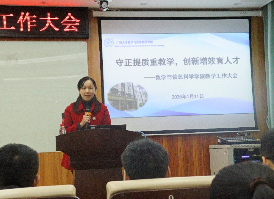 为进一步学习贯彻全国教育大会精神,推动信息技术赋能本科教育教学、加强学院基层教学组织建设、提升公共数学课程的教学质量、强化数学拔尖创新人才培养。1月11日,英国365官网在报告厅召开教学工作大会。会议由学院党委书记吴华丽主持,全体教职工参加了会议。