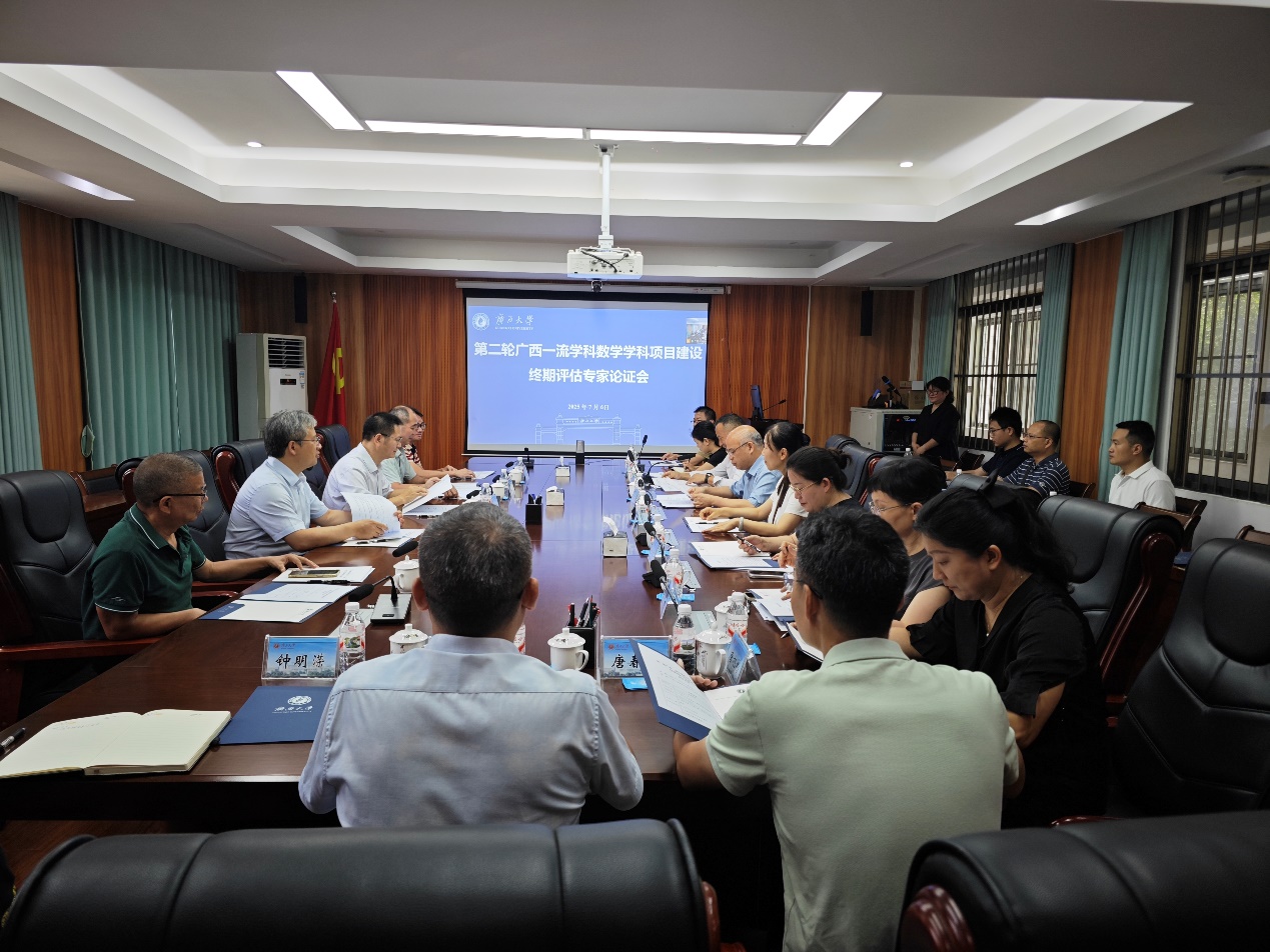 7月6日,我校召开第二轮广西一流学科数学学科项目建设终期评估专家论证会。博雅学者、华中师范大学数学与统计学学院邓引斌教授;教育部数学类专业教指委秘书长、北京航空航天大学数学学院韩德仁教授;广西高层次人才、广西民族大学数学科学学院刘振海教授;南宁师范大学党委副书记、校长隆广庆教授;教育部学科评议组专家、厦门大学数学科学学院谭忠教授;教育部数学类专业教指委委员、北部湾大学党委副书记唐高华教授;教育部学科评议组专家、西安交通大学数学与统计学院肖燕妮教授;教育部新世纪优秀人才支持计划人选、浙江科技大学喻高航教授;中国数学学会常务理事、教育部学科评议组专家、武汉大学数学与统计学院赵会江教授共9人组成专家评估组对我校数学学科建设成效进行全面评审。校党委常委、副校长梁恩维出席会议并致辞。