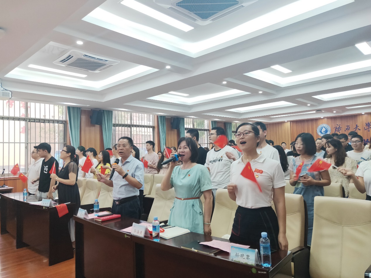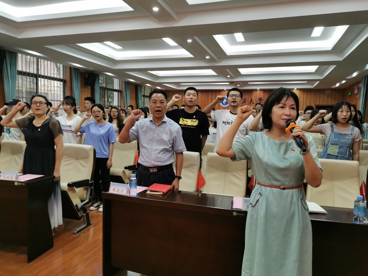 郭海燕副书记首先带领全体党员重温入党誓词,铿锵有力的宣誓声响彻报告厅,现场所有人都深受感染,仿佛回到了那个风雨如磐的年代。