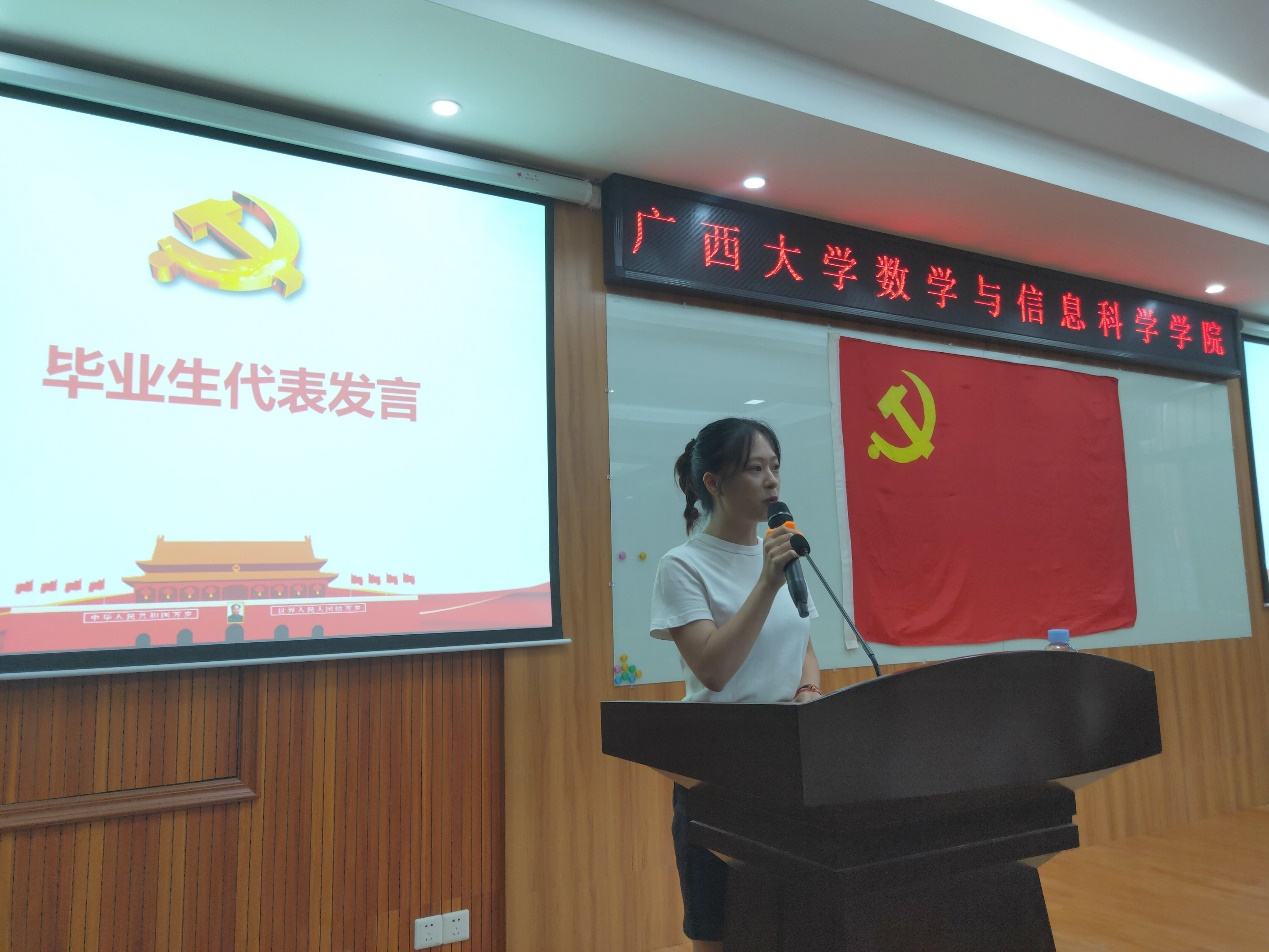 2018级硕士毕业生党员代表秦子雁在发言中感谢党组织三年来的栽培与关爱,表示作为毕业生党员,一定会牢记自己的党员身份,将小我融入国家民族之大我,努力学习,勤奋工作,为中华民族的伟大复兴贡献自己的青春力量。