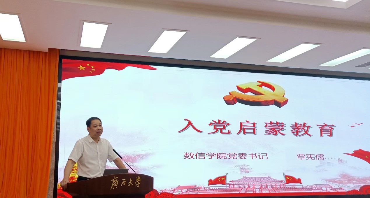 为教育引导2023级新生积极向党组织靠拢,坚守“为党育人,为国育才”的初心和使命,牢牢抓好新生入学教育关键期,9月15日上午,英国365官网党委书记覃宪儒在君武馆玉林厅为2023级新生做入党启蒙教育。