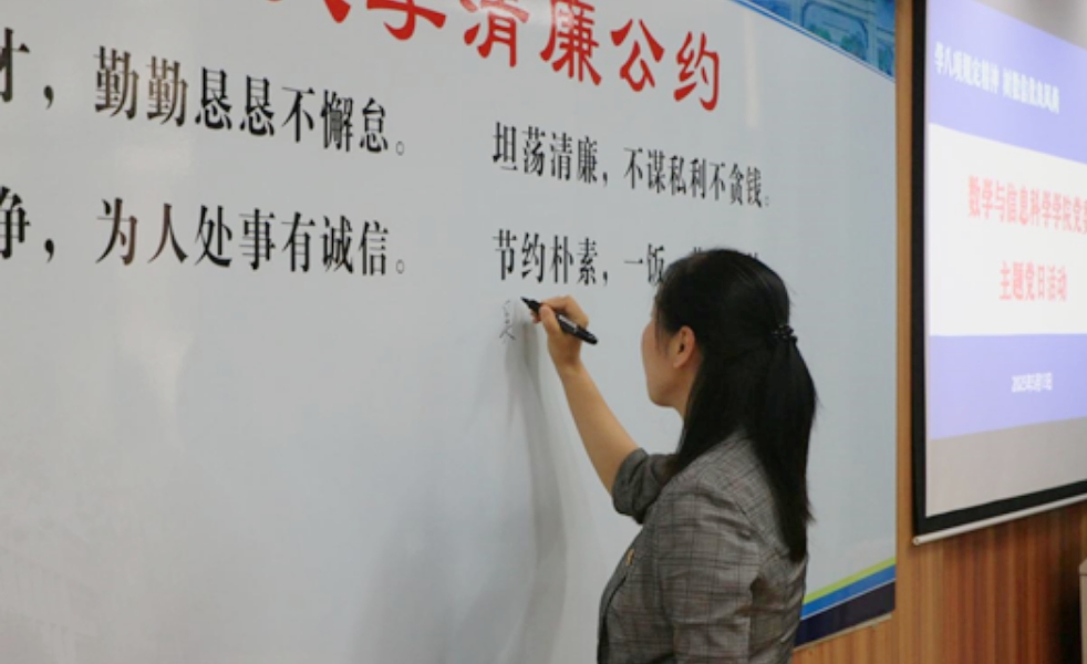 廉洁诚信,清廉公约签名倡议。学院纪委委员、教师党员代表韦琳娜和学生党员代表周培烽分别宣读了“学中央八项规定精神 树数信优良风尚”倡议书,倡议学院师生以实际行动践行中央八项规定精神,从自身做起、从现在做起,共同树立数信优良风尚。随后,参加活动的师生党员依次在英国正版365首页官网清廉公约展板上签名承诺,践行清廉公约。